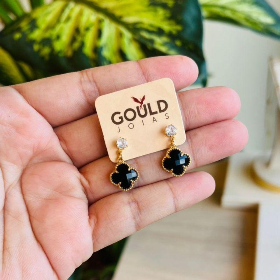 BRINCO DUPLO TREVO PRETO/ BRANCO E CRISTAL...
